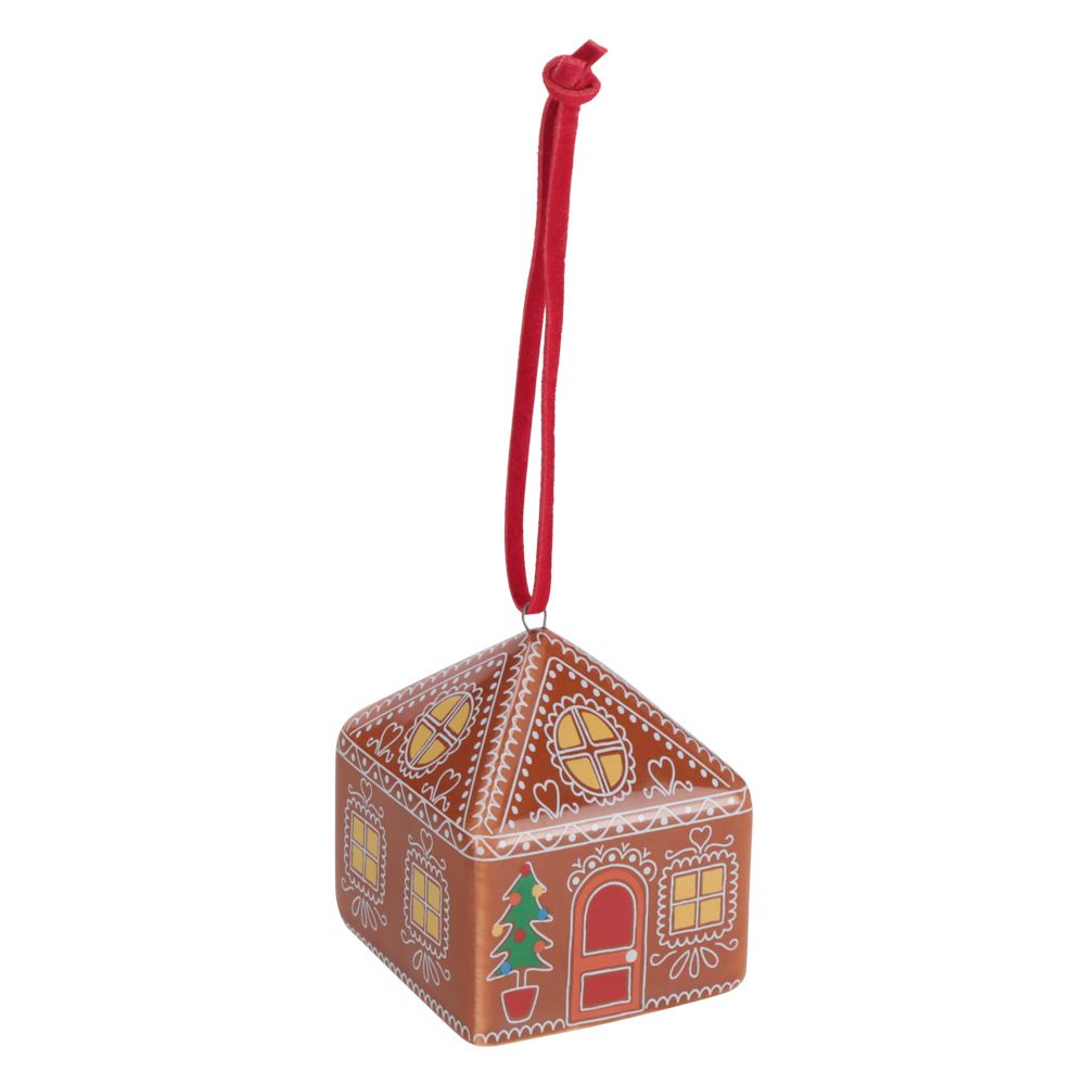 Adorno de cerámica pintada con forma de casita para colgar en el árbol de navidad.