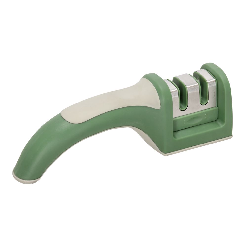 Afilador de cuchillos de plástico con rodillos de acero inoxidable en dos grosores. Podrás ocuparlo en diferentes tipos de hojas. Tiene un tamaño de 19.5x6x5 cm.