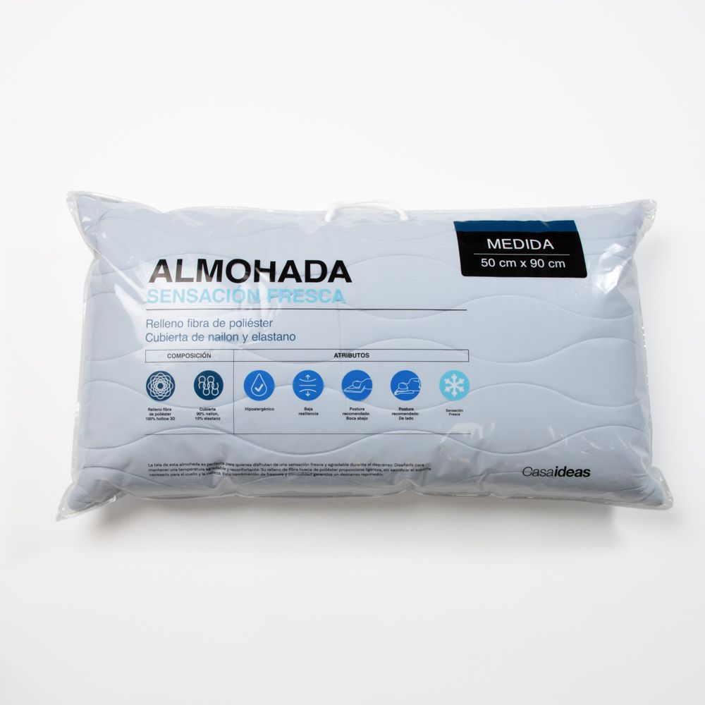 Almohada con tecnología “Sensación Fresca”. La tela innovadora de esta almohada es ideal para personas que aman la sensación fresca en sus camas. Su composición de polietileno y poliéster entregan frescura y suavidad. Cuenta con una capa posterior de poliuretano que evita la absorción de líquidos, logrando repelerlos de la superficie. De esta forma, facilita su limpieza y, al ser repelente, asegura una mayor vida útil del colchón. Tiene un tamaño de 50x90 cm.
