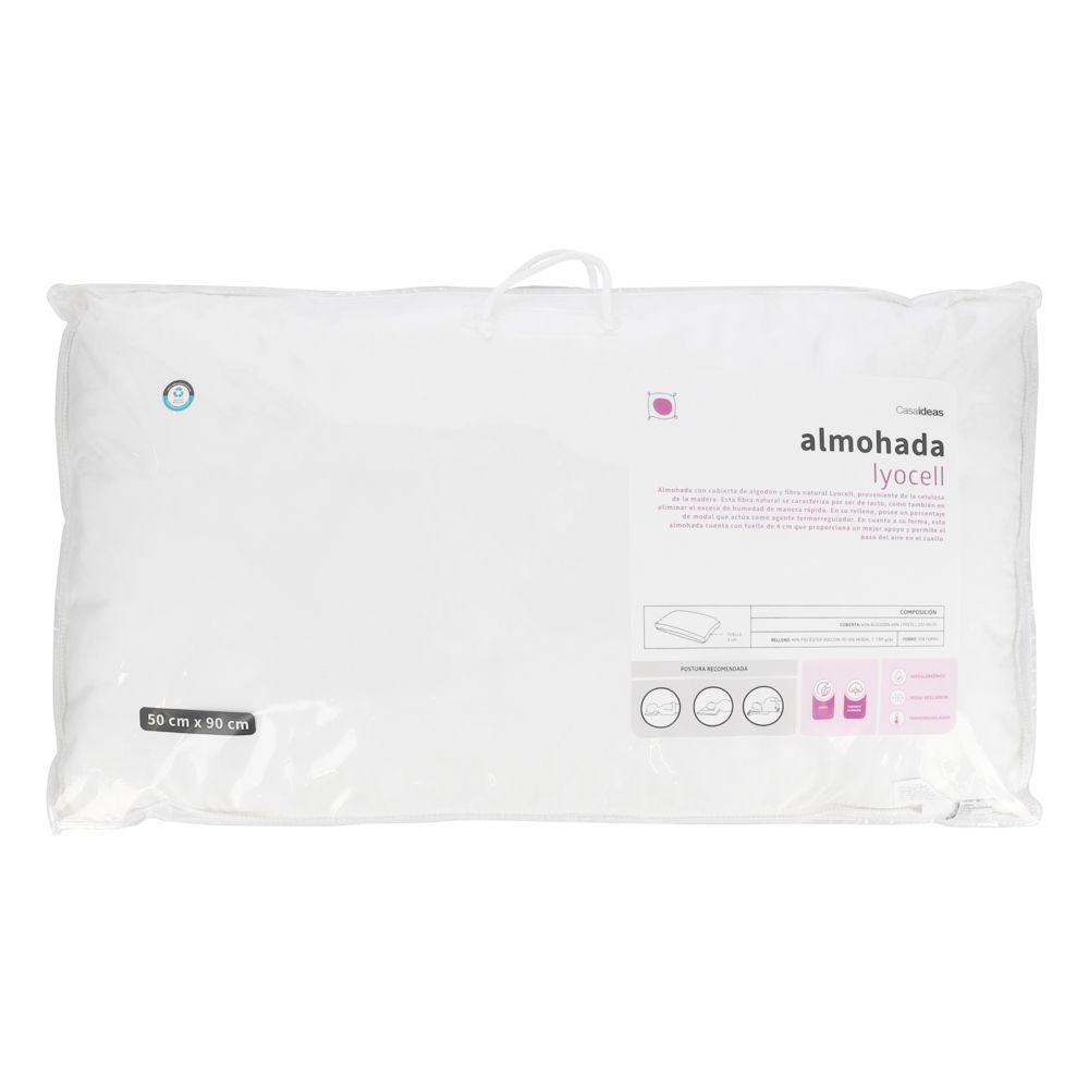 Almohada con cubierta de algodón y fibra natural Lyocell, proveniente de la celulosa de la madera. Esta fibra natural se caracteriza por eliminar el exceso de humedad de manera rápida. En su relleno, posee un porcentaje de modal que actúa como agente termorregulador. En cuanto a su forma, esta almohada cuenta con fuelle de 4 cm que proporciona un mejor apoyo y permite el paso del aire en el cuello. Producto disponible en dos medidas Cuenta con certificación Oeko-Tex. Lavar a mano. No blanquear. Secar en línea. No planchar. No lavar en seco.