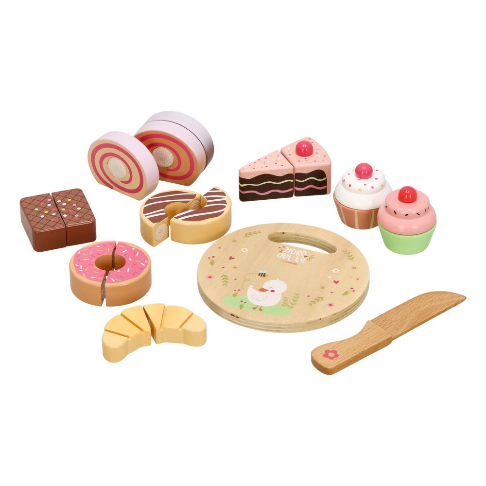 Balde con set de pastelitos plásticos con 10 piezas totales (1 tabla, 1 cuchillo de madera y 8 pastelitos). Ideal para jugar a cocinar y cortar pastelitos debido a su velcro que permite cortar y pegar.