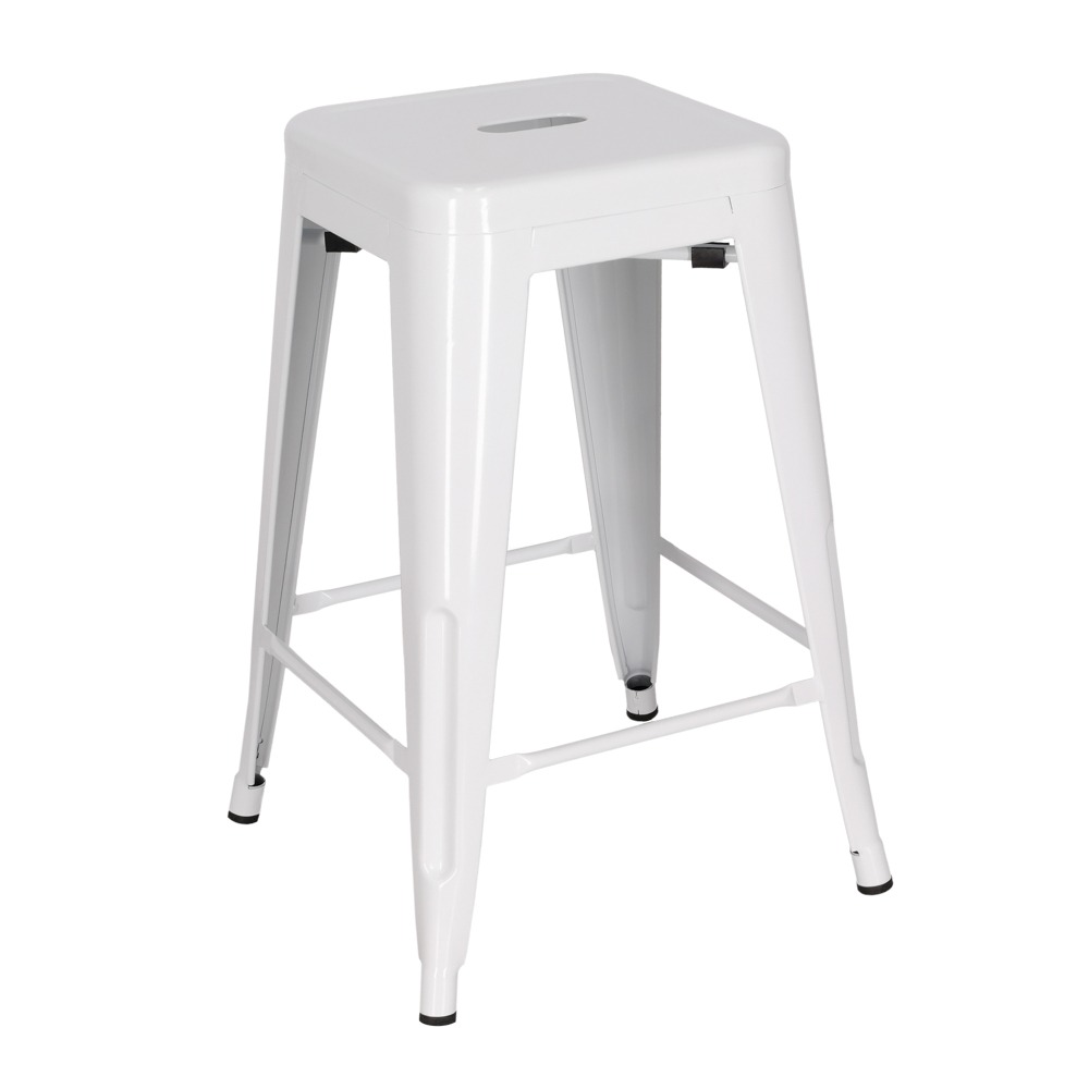 Banco de metal apilable electropintado. Ideal para ocupar en mesones altos. Resiste hasta 180 kg. Tiene un tamaño de 41x41x61 cm.