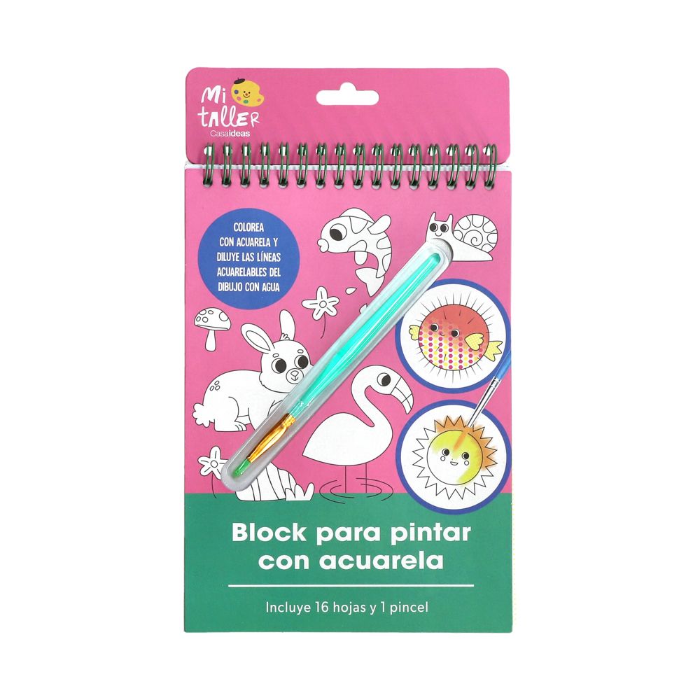 Block para pintar con acuarelas tamaño A5. Incluye diseños ya listos para pintar. Usando el pincel y un poco de agua diluye la acuarela de cada hoja y pinta con ellas los dibujos.