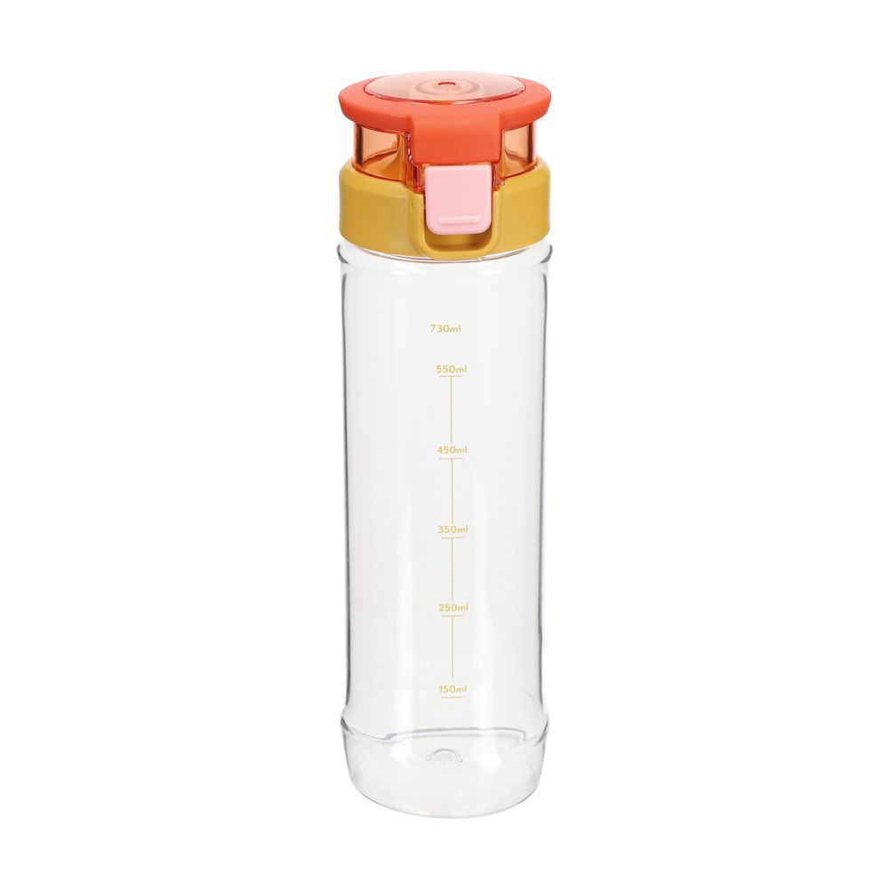 Botella para agua de tritán. Gracias a su material, esta botella es resistente, fácil de transportar, limpiar y libre de BPA. Tiene una capacidad de 730 ml. Tiene un tamaño de 7.4x26 cm.