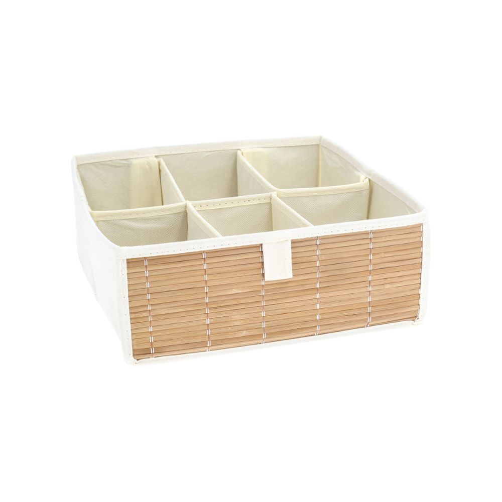 Caja de bambú y algodón con divisiones. ideal para organizar los cajones. Este producto viene plegado. Tiene un tamaño de 28x28x11 cm y una capacidad de 8.6 l. No lavar a máquina. No blanquear. No usar secadora. No planchar. No lavar en seco. Limpiar conpaño húmedo.