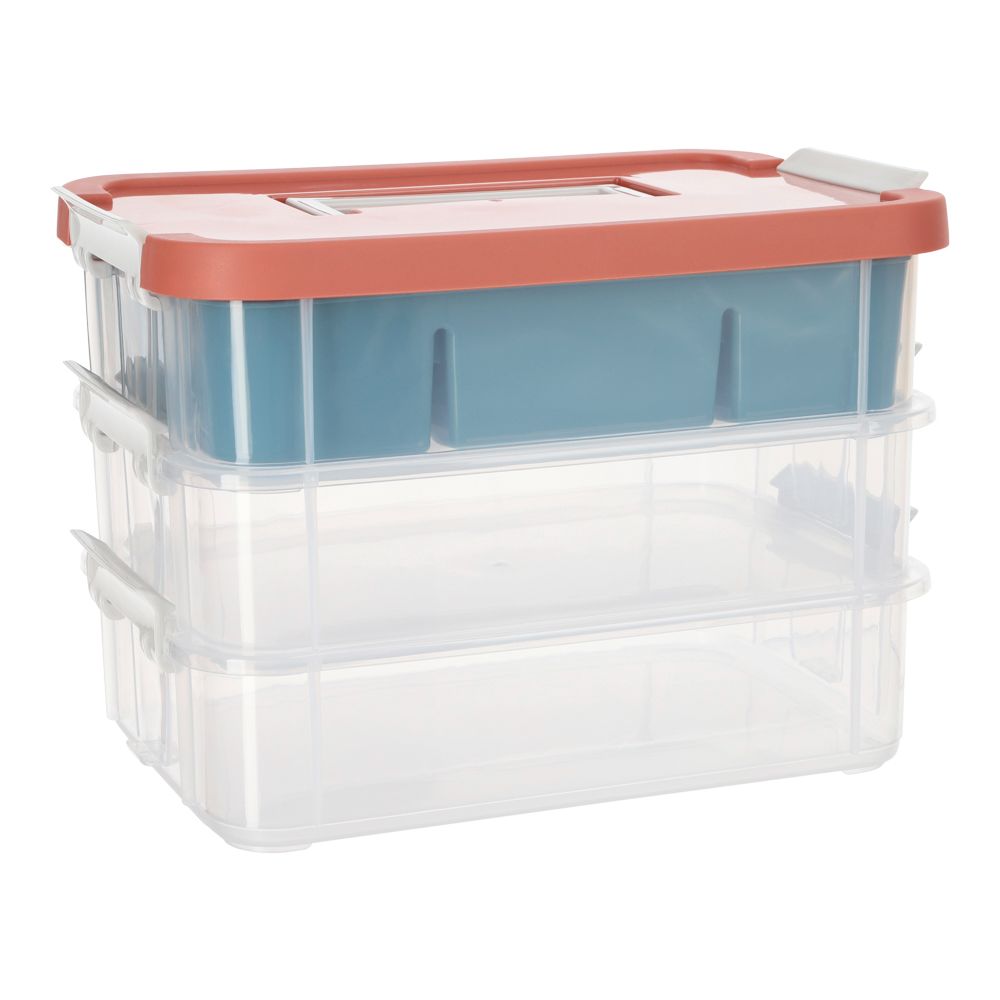Caja multifuncional de plástico polipropileno con 3 compartimientos apilables y bandeja con divisiones. Tiene un tamaño de 27.5x18x19.5 cm.
