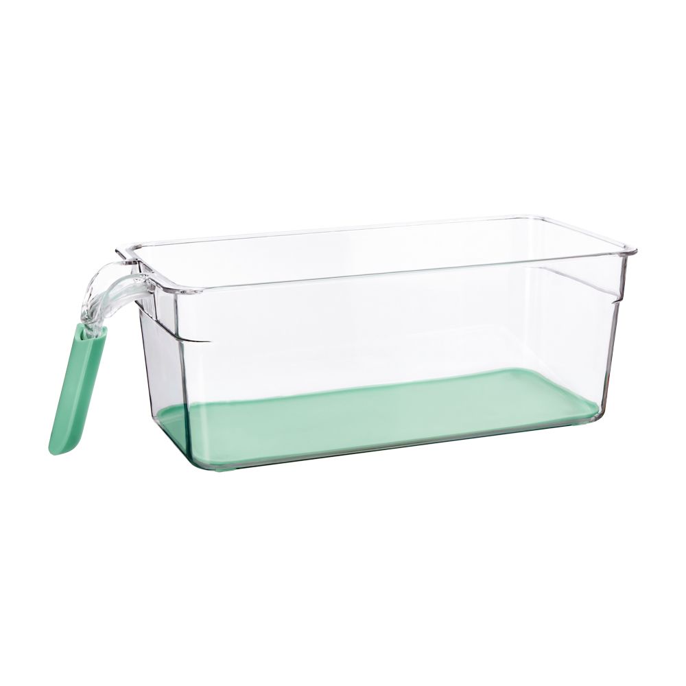 Caja organizadora de plástico para el refrigerador con mango para agarrar. Tiene un tamaño de 29x12.2x9.5 cm.