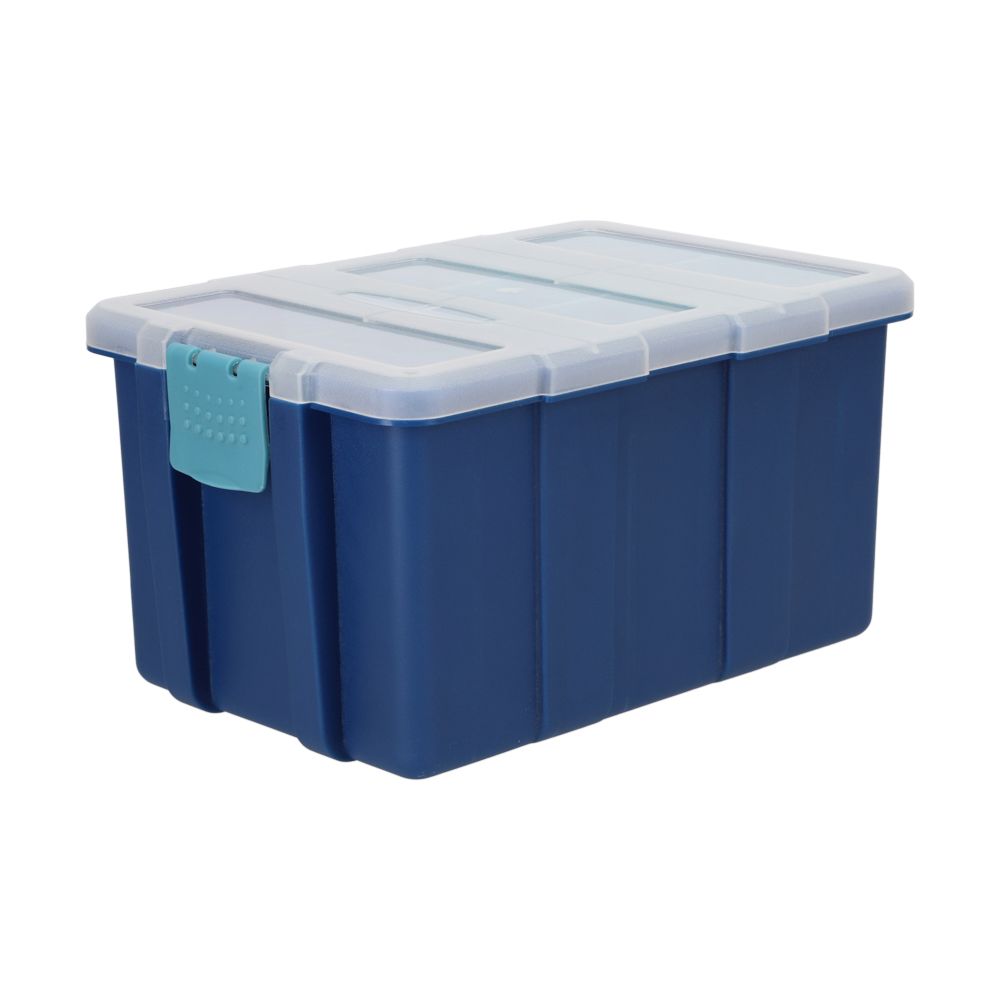 Caja organizadora multifuncional de plástico. Contiene variados compartimientos y resistente tapa. Tiene un tamaño de 22x15.5x12 cm.