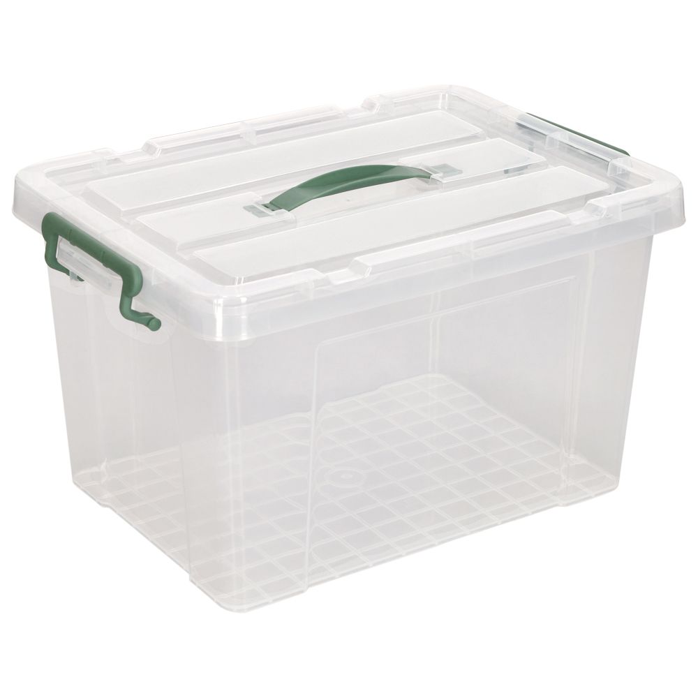 Caja de plástico polipropileno con tapa. Tiene una capacidad de 20 litros. Tiene un tamaño de 45.5x32x18 cm
