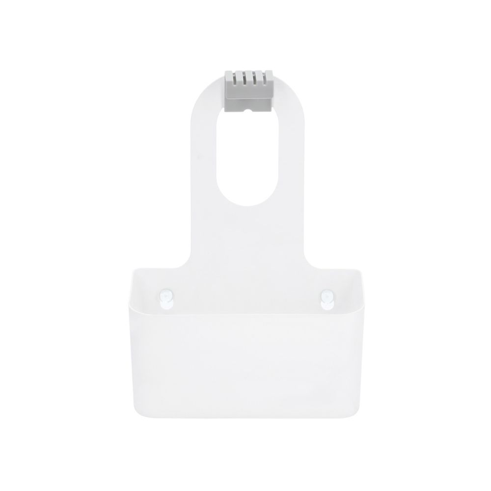 Canasto organizador de plástico con gancho para colgar en puertas, ducha o barra de cortina, ranura para ensamblar con otro organizador y ventosas para reforzar adhesión. este producto resiste hasta 2.5 kg. Tiene un tamaño de 24x10.5x35 cm.