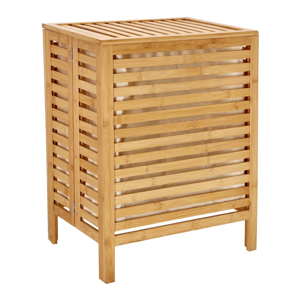 Canasto para la ropa doble de bambú y plegable. Tiene un tamaño de 45.4x33x60.3 cm.
