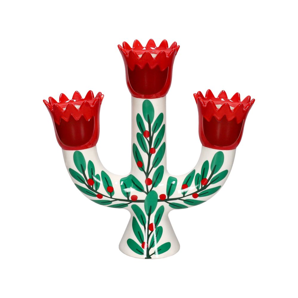 Candelabro triple con diseño navideño. Ideal para velas tamaño dinner.