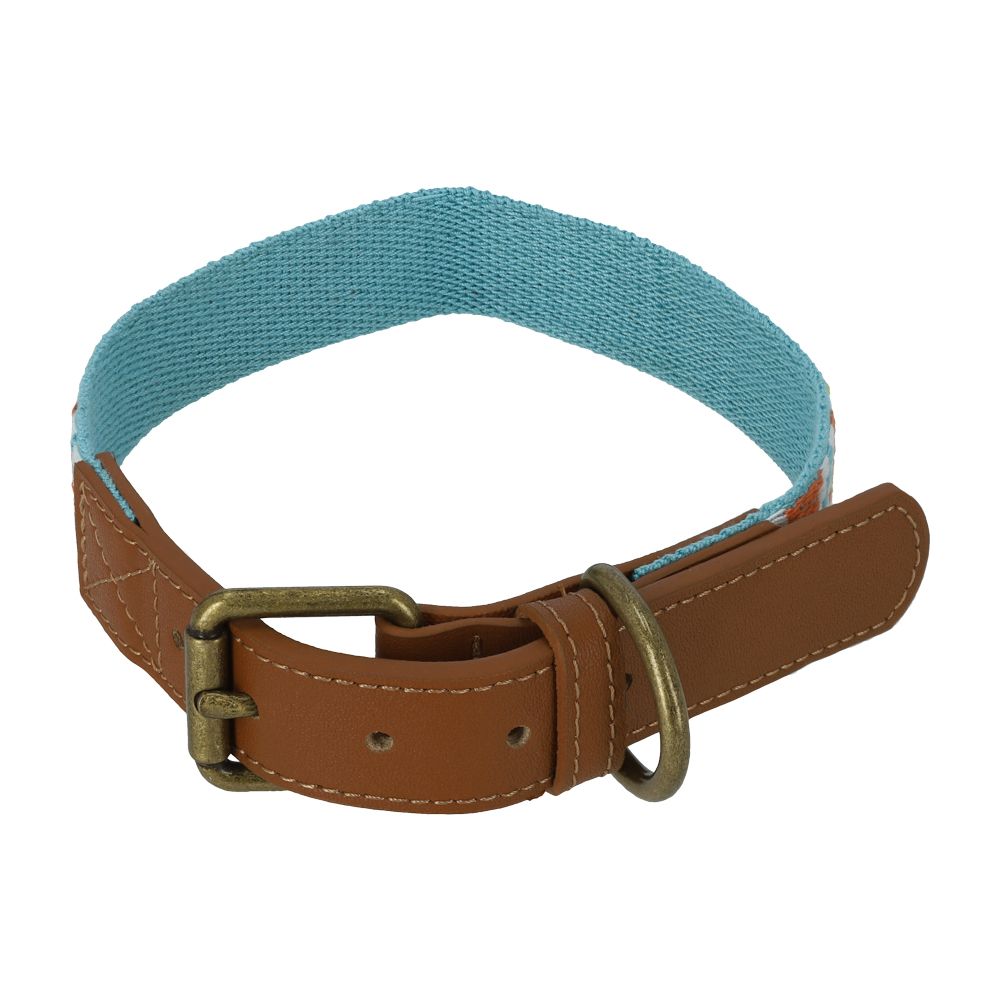 Collar de cinta tejida cuero-algodón con hebilla de plástico y argolla de acero tipo D, ajustable al cuello de tu mascota. Disponible en tres tallas.Talla S - Mascotas pequeñas mínimo: 23 cm, máximo: 31 cm. Talla M - Mascotas medianas mínimo: 28 cm máximo: 41 cm. Talla L - mascotas grandes mínimo: 36 cm. máximo: 51 cm.