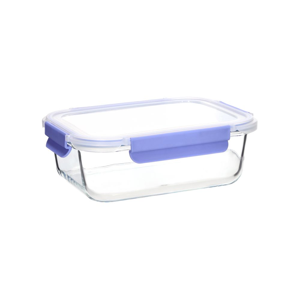 Contenedor de vidrio con tapa de plástico con click y borde de silicona para un cierre hermético. Producto resistente al calor