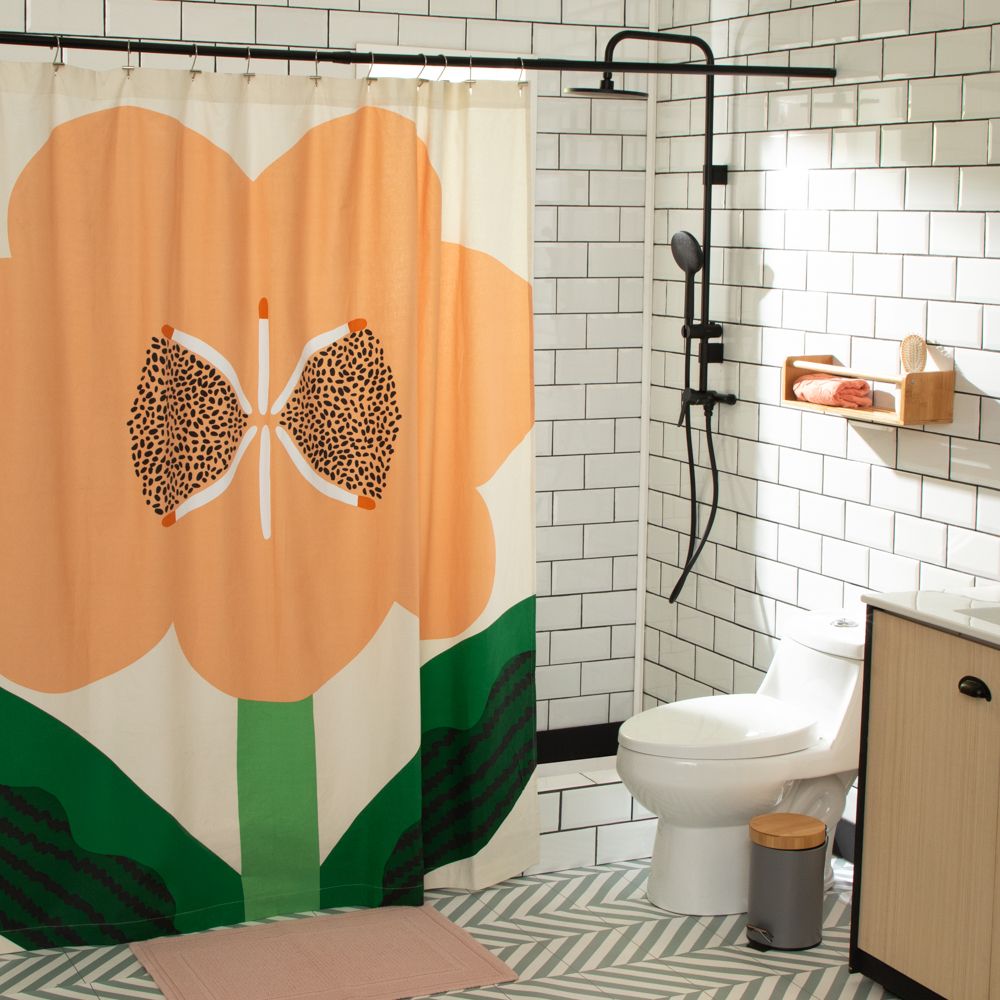 Cortina de baño de algodón con diseño estampado. Tiene un tamaño de 180x190 cm y un gramaje de 225 g. No incluye forro. Cuenta con certificación Oeko-Tex.