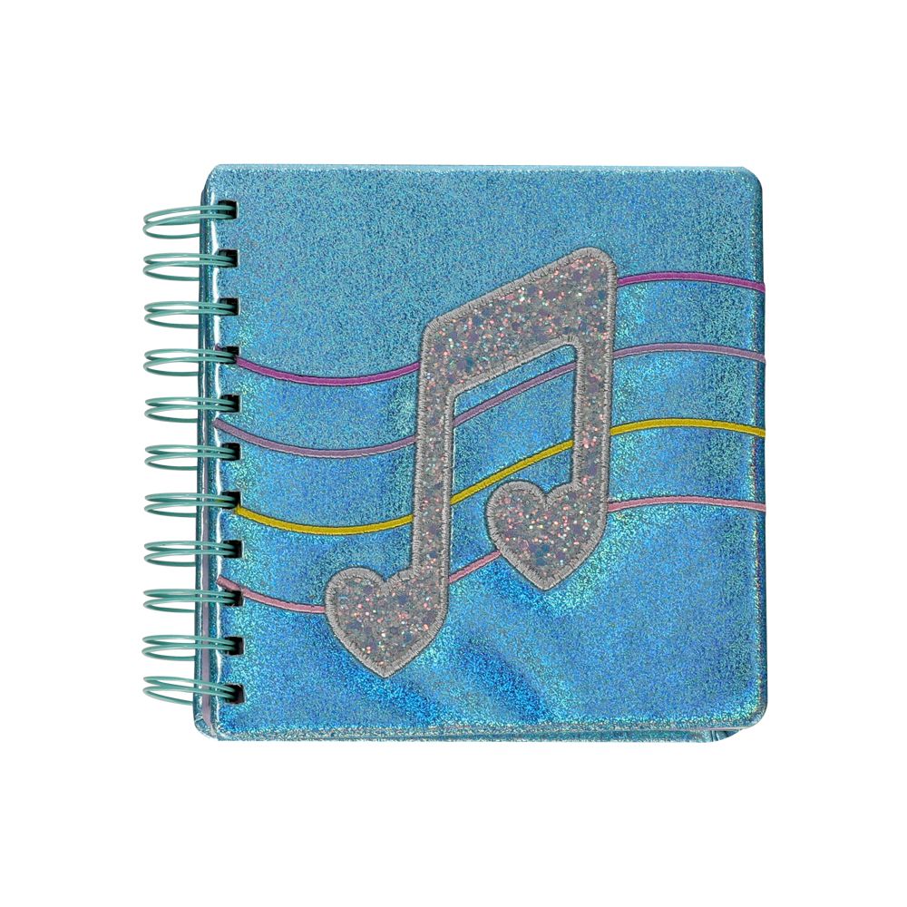 Cuaderno espiral con cubierta glitter. Cuenta con 40 hojas de color y 40 hojas blancas. Tiene un tamaño de 15x15 cm.