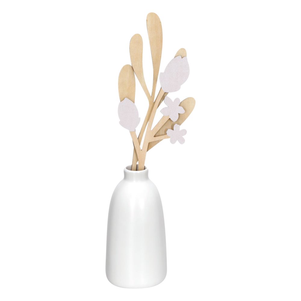 Difusor de aroma con botella de cerámica con varitas y hojas. Tiene un aroma de vainilla coco y una capacidad de 95 ml. La botella tiene un tamaño de 6.5x13 cm y las varitas un tamaño de 8.5x20 y 27 cm.