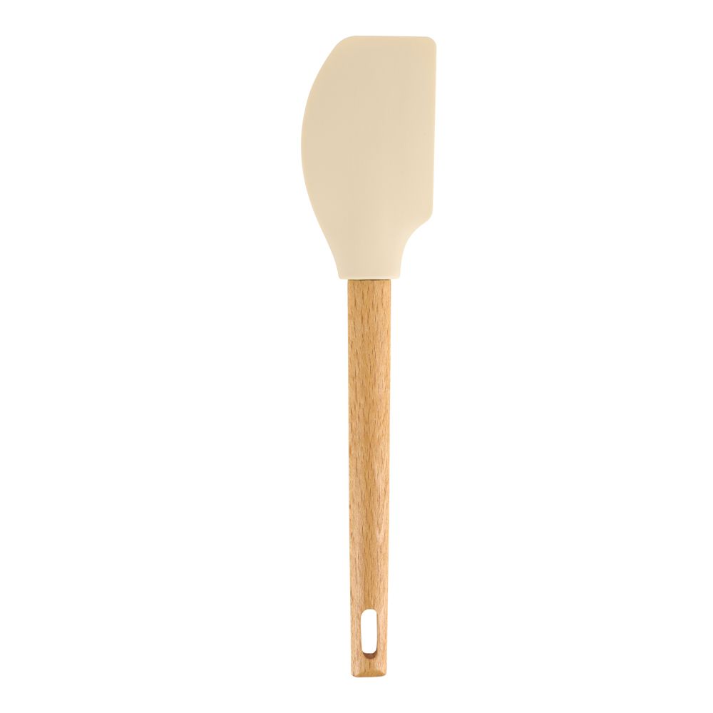 Espátula de silicona con mango de madera de caucho para repostería. Tiene un tamaño de 5x1.9x25.4 cm. Soporta una temperatura máxima de 220º C.