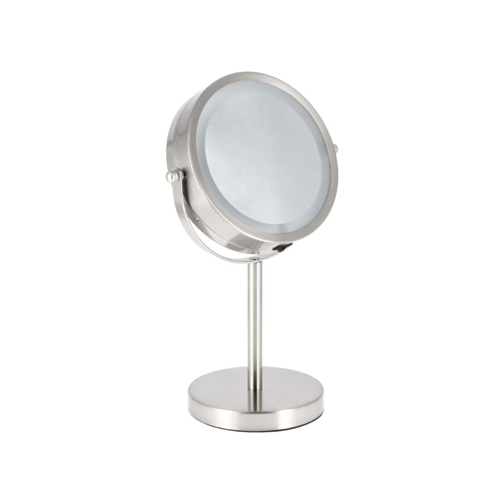 Espejo con pedestal y luz LED con aumento 5x por uno de sus lados. Gracias a su iluminación, podrás realizar tu rutina de maquillaje y cuidado personal de manera más cómoda y fácil. Este artículo requiere 4 pilas AAA (No incluidas)