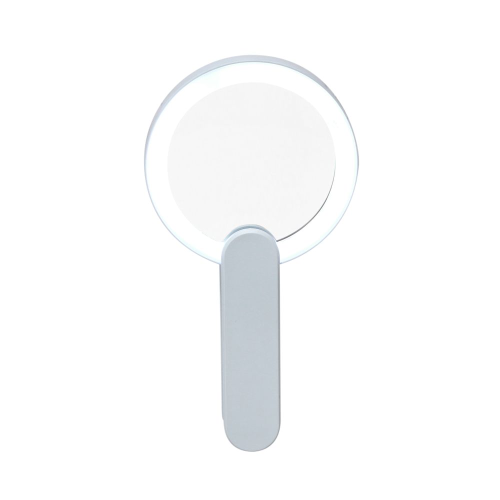 Espejo plegable con luces LED y puerto de carga USB. Tiene un diámetro de 9 cm.