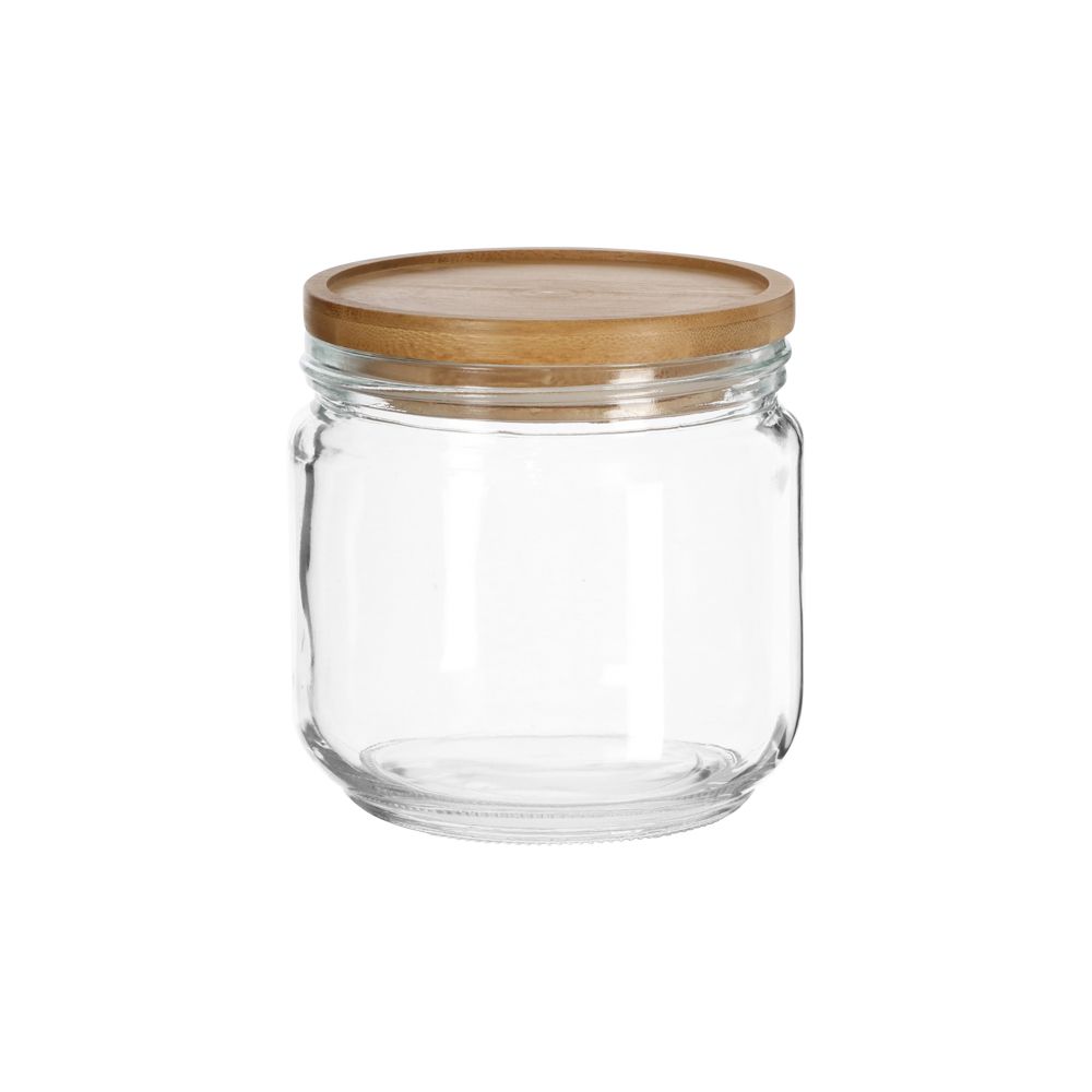 Frasco de vidrio con tapa hermética de bambú y espacio para anotar. Ideal para guardar alimentos en tu despensa. Tiene una capacidad de 700 ml.
