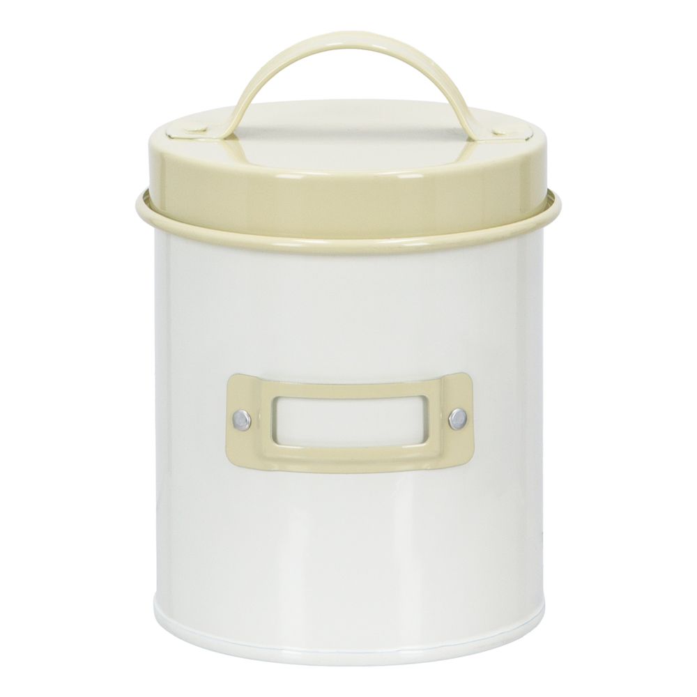 Frasco con tapa de acero galvanizado con terminado enlozado. Cuenta con espacio para escribir. Tiene una capacidad de 1300 ml. Tiene un tamaño de 11x14 cm.