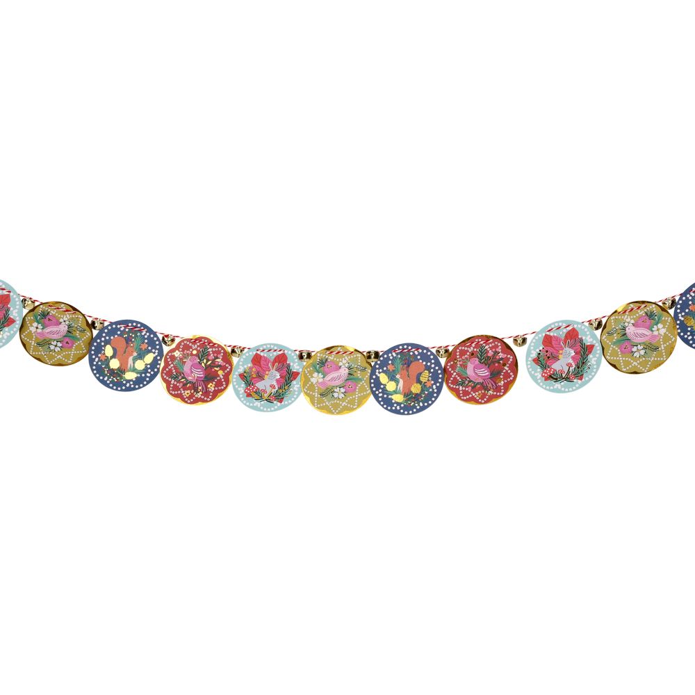 Guirnalda navideña de cartón y con detalles en cascabeles.