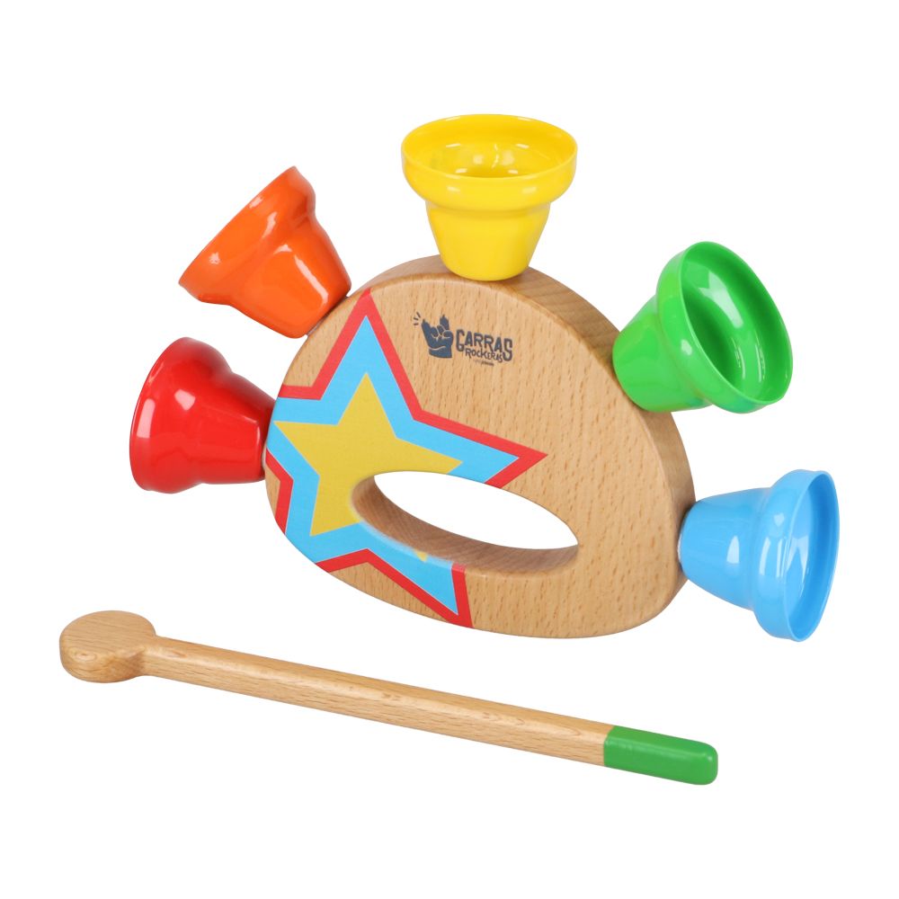 Instrumento musical “Campanas de mano”. Hecho de madera con 5 notas para tocar. Incluye partitura con 2 canciones. Ideal para mayores de 3 años.