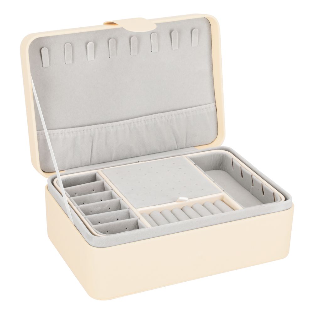 Joyero tipo estuche para ordenar tus joyas. Incluye dos niveles con distintas divisiones para organizar tus accesorios en compartimientos separados. Ideal para poner en armarios o closets. Tiene un tamaño de 24x16x9 cm.