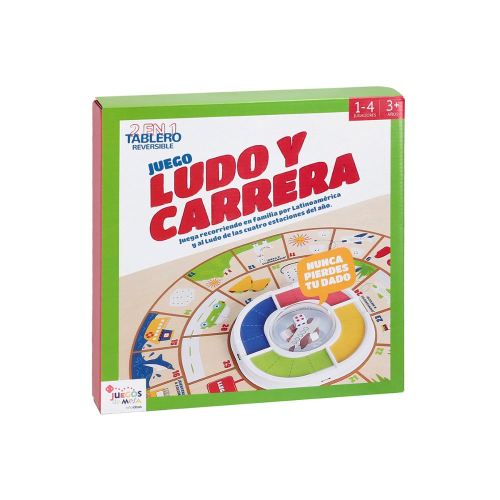 Juego “Ludo y Carrera” Tablero reversible 2 en 1 para poder jugar “Ludo” y “Carrera”. Puede jugarse con entre 1 a 4 personas. Contiene: 1 tablero. 1 pieza central con dado. 16 fichas de jugador. instrucciones de juego. Ideal para mayores de 3 años.