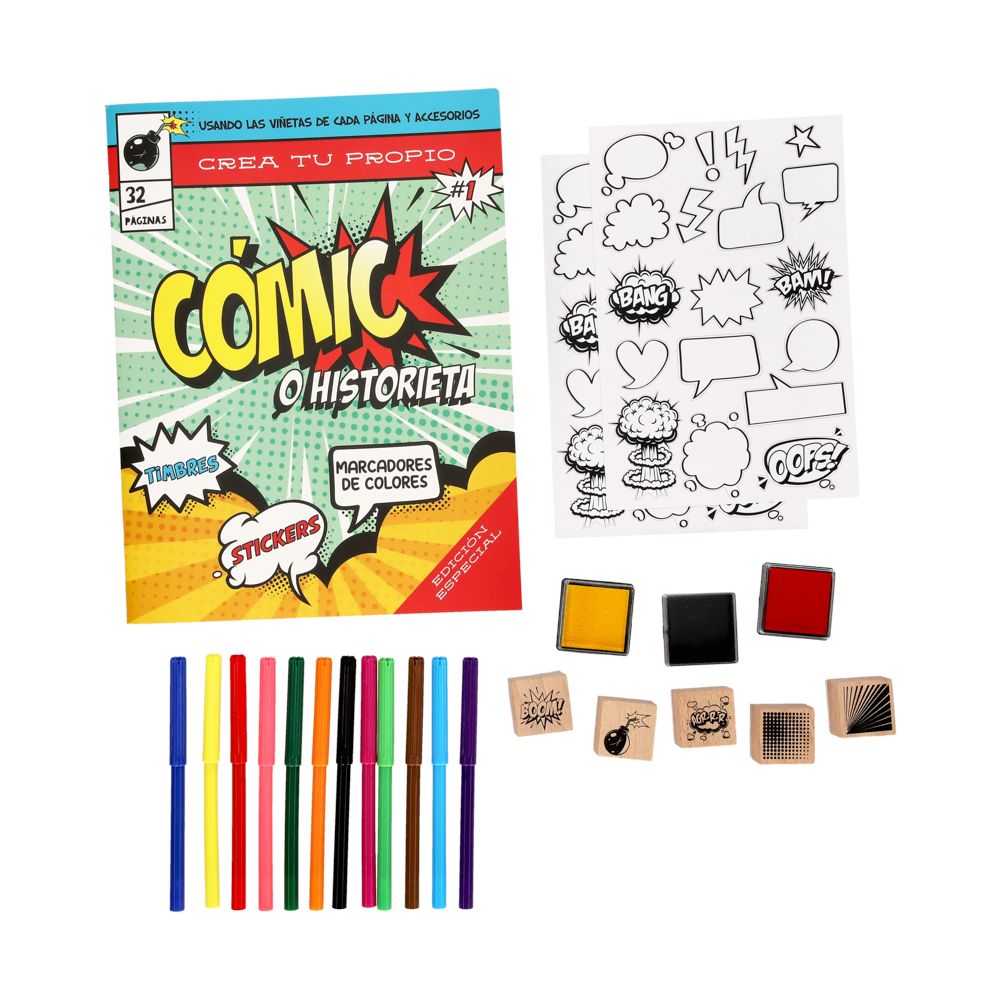 Kit para crear un comic. ¡Podras dibujar tus propias historias de aventuras! Incluye 1 libro de 32 páginas tipo comic con viñetas, 2 hojas de adhesivos, 12 marcadores de colores, 5 timbres, 3 tampones de tinta.