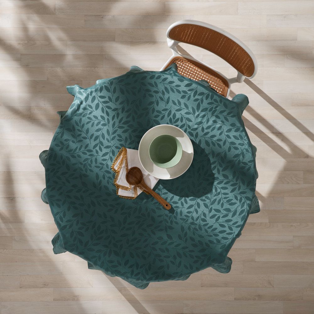 Mantel de poliéster y lino con tejido textura jacquard. Producto disponible en 3 medidas. Cuenta con certificación Oeko-Tex.