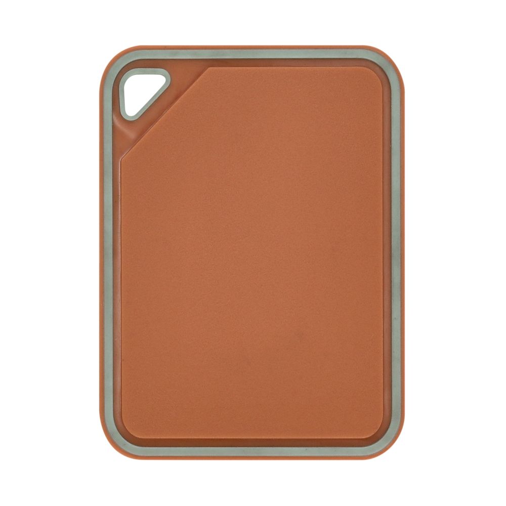 Mini tabla plástica para cortar con una cara antideslizante. Tiene un tamaño de 19.2x14.2x0.7 cm.