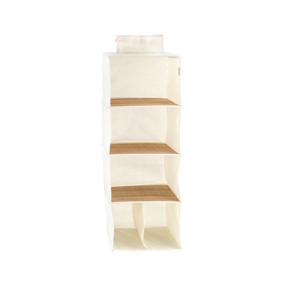 Organizador colgante y plegable de bambú y algodón para clóset, incluye un separador. Tiene un tamaño de 30x30x84 cm. No lavar a máquina. No blanquear. No usar secadora. No planchar. No lavar en seco. Limpiar con paño húmedo.