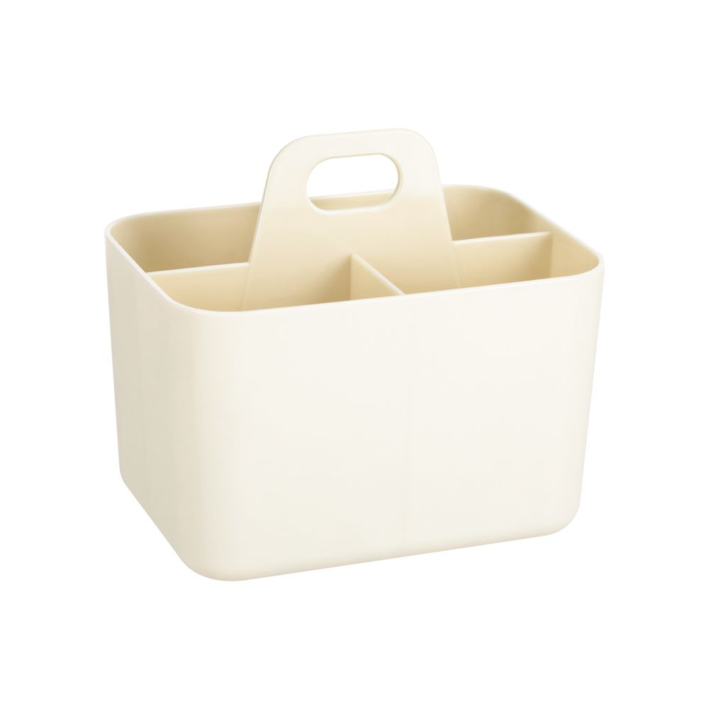 Organizador para cosméticos de plástico. Tiene múltiples compartimientos. Tiene un tamaño de 15x10.8x13.5 cm.