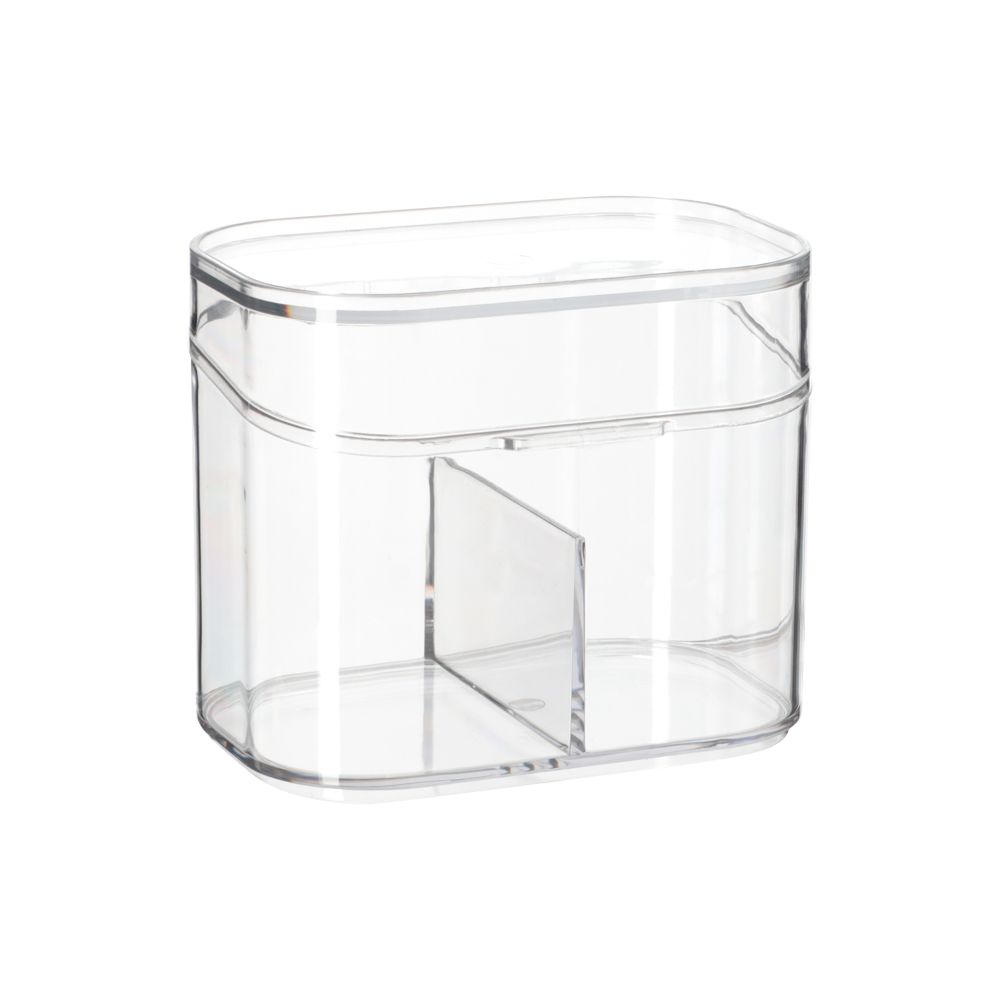 Organizador pequeño de plástico PET transparente. Tiene un tamaño de 10.5x7.5x9 cm.