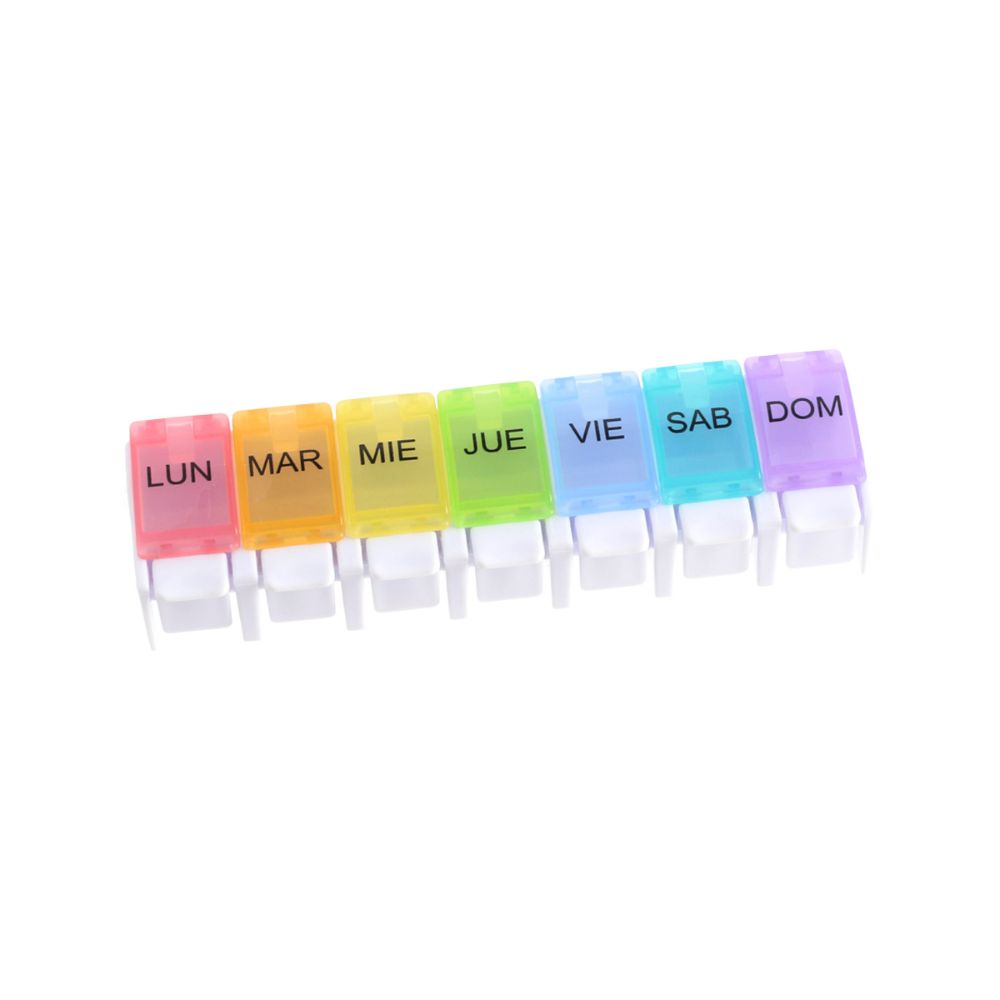 Pastillero semanal con 7 compartimientos y pulsador. Ideal para llevar a tus viajes.