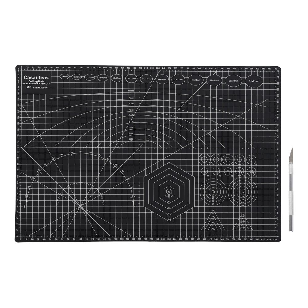 Plantilla de plástico, incluye cortador y hojas de repuesto. Tiene un tamaño de 45x30 cm.