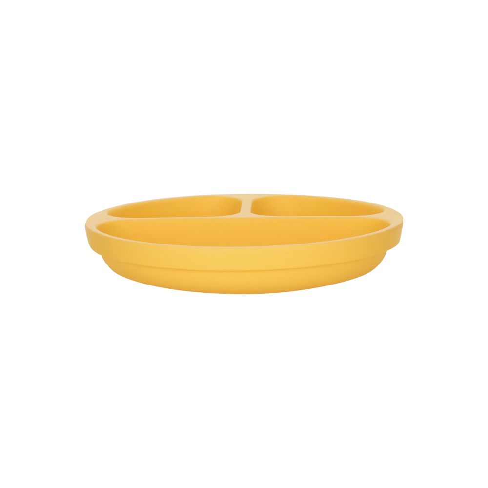 Plato de fibra de bambú con divisiones. Apto para contacto con alimentos. Tiene un diámetro de 18.5x3.2 cm. Producto libre de BPA.