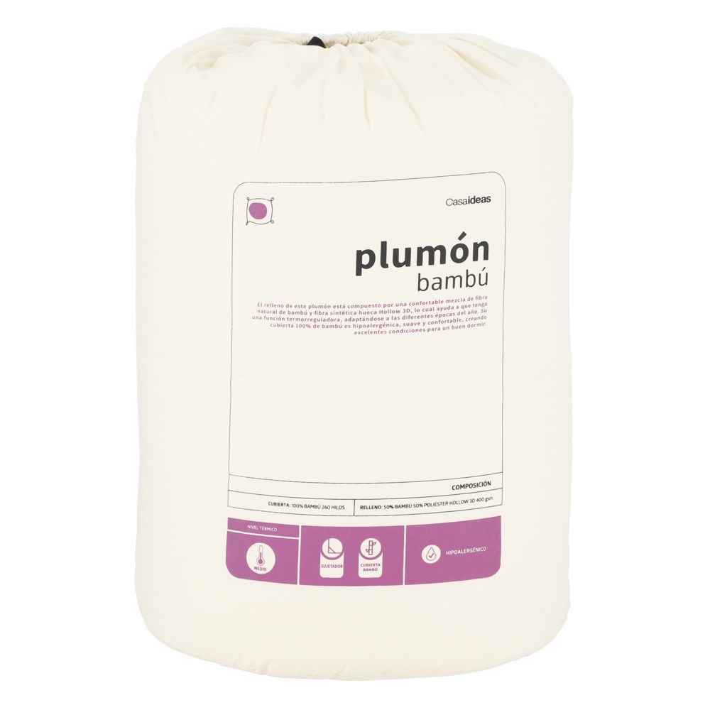Plumón/Duvet bambú. El relleno de este Plumón/Duvet está compuesto por una confortable mezcla de fibra natural de bambú y fibra sintética hueca Hollow 3D, lo cual ayuda a que tenga una función termorreguladora, adaptándose a las diferentes épocas del año. Su cubierta 100% de bambú es hipoalergénica, suave y confortable, creando excelentes condiciones para un buen dormir. Producto disponible en cinco medidas. No lavar a máquina. No blanquear. Secar en línea. No planchar. Lavar en seco.