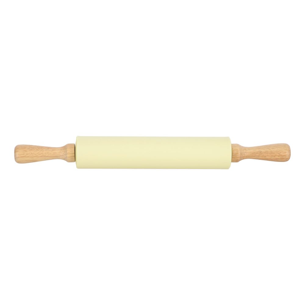 Rodillo de silicona y mangos de madera para ocupar en preparaciones de repostería. Tiene un tamaño de 43.5x5x5 cm.