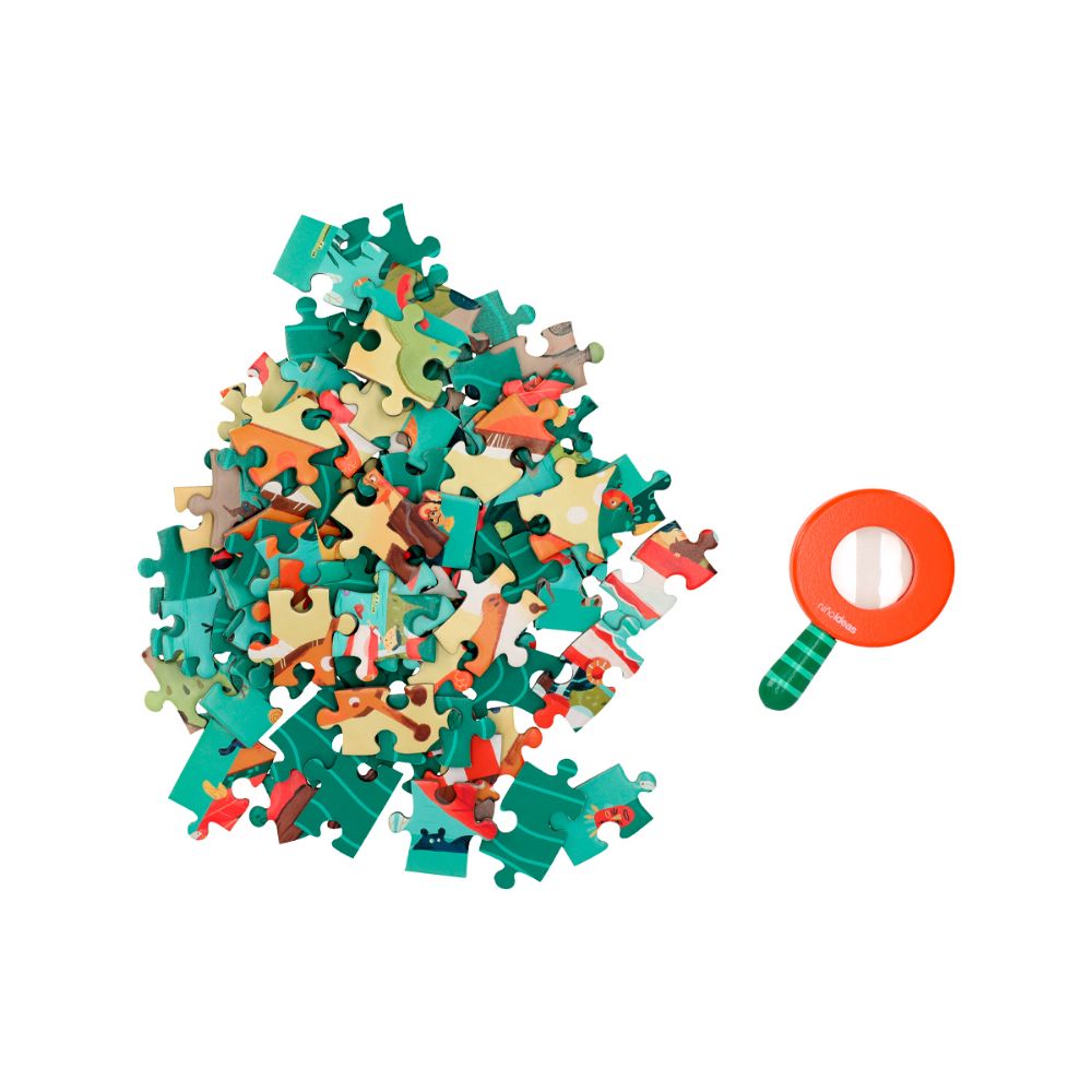 Rompecabeza detective de cartón de 100 piezas. Incluye una lupa para que te diviertas encontrando las sorpresas escondidas cuando termines de armar el puzzle. Ideal para mayores de 7 años.
