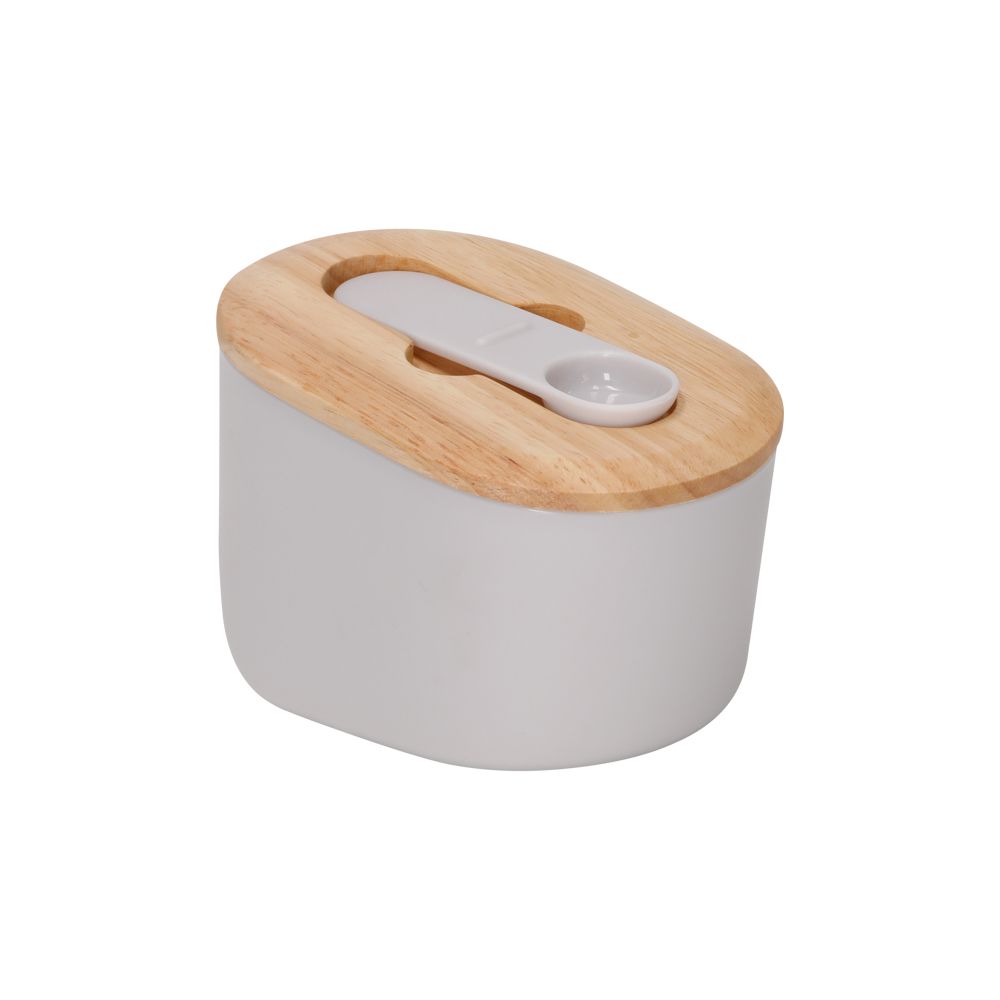 Salero para cocina con cuchara y tapa. Producto libre de BPA. Tiene un tamaño de 12.1x8.1x8.3 cm.