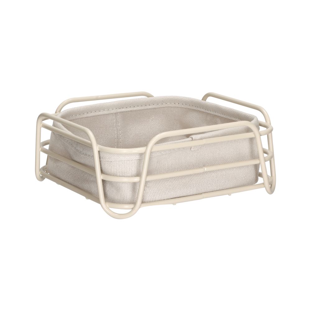 Servilletero de metal con forro de tela y asas para transportar. Tiene un tamaño de 15x15 cm.