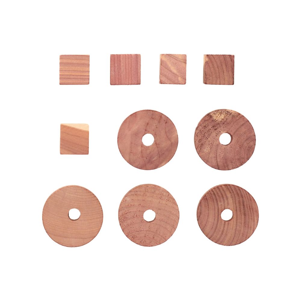 10 piezas 100% madera cedro para mantener a las polillas alejadas. Se recomienda ocupar las piezas de cubos en espacios cerrados como cajones, guardarropa, zapatos, maletas y más. Se recomienda usar las piezas circulares en ganchos de ropa.
