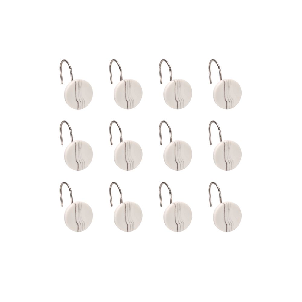 Set de 12 ganchos de poliresina con diseño marmolado para colgar la cortina de baño. Limpiar con paño húmedo.