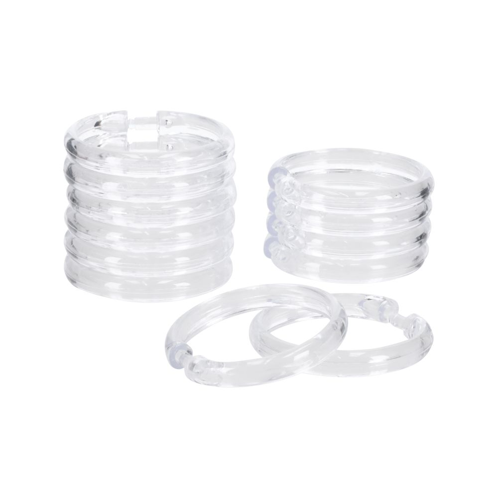 Set de ganchos de plástico para colgar la cortina de baño.