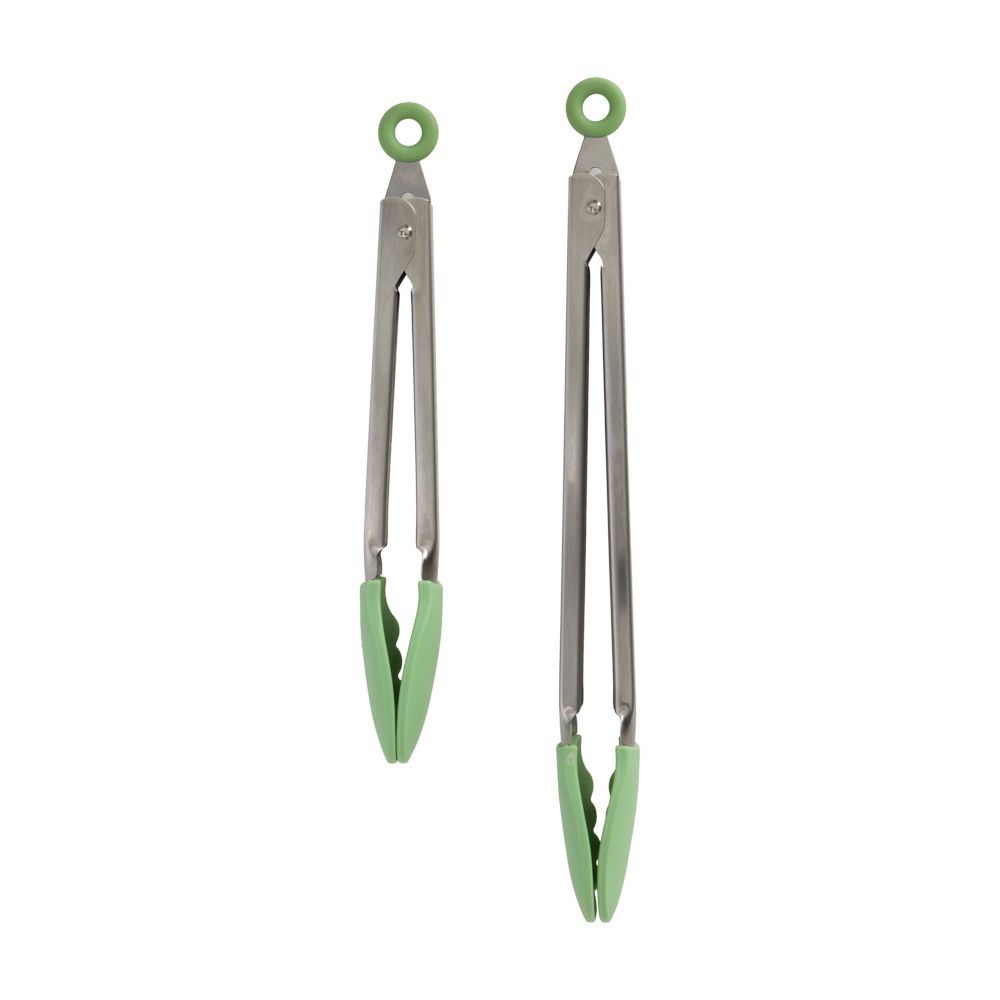 Set de 2 pinzas cocina de acero inoxidable con punta de silicona. Contiene una pinza corta 3x4.5x26.5 cm y una pinza larga 3x4.5x34 cm.