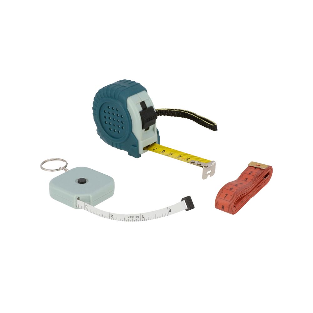 Set de 3 cintas métricas de plástico con aplicación metálica. Incluye cintas de 1. 2 y 3 metros.
