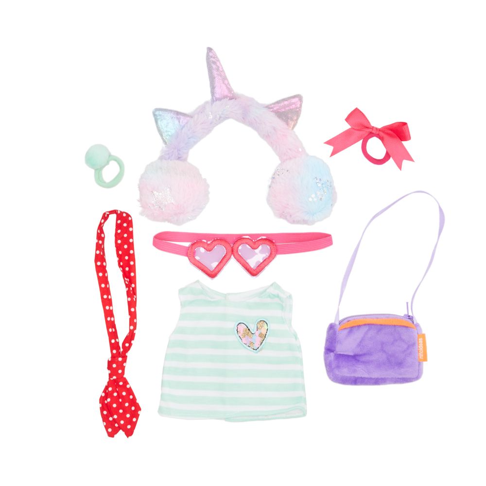 Set de complementos y accesorios de ropa de muñeca. Ideal para complementar con nuestras muñecas Josefa y Estela. Incluye: bolsita con cierre, 1 liga de mano, 1 cintilloa, 1orejeras de unicornio, 1 par de lentes de corazon, 1 playera.
